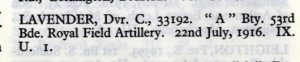 Newton in Hill Side, Mosbro. He enlisted in the early days of the War in the R.F.A. In a letter to Mr Newton, his Captain says: “I am exceedingly sorry to have to inform you that Driver Lavender of the Battery under my command, was killed the other night by a shell when he was bringing up ammunition to the Battery. He was a very good hard working driver and died doing his duty”. He is regretted by the whole Battery”. He was 26 years of age.