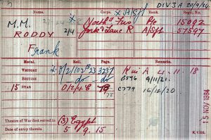 Frank was born in Eckington Derbyshire, in July 1889 to John and Elizabeth Ann Roddy. Frank was aged 1 in the 1891 census, he lived with his sisters Nellie, Letitia and his brother Willie. His father was a Railway Wagon worker.