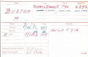Herbert Buxton is one of the 49 men who served for their country and was killed in Action in the First World War, whose name is listed on St Mark’s Church Cenotaph in Mosbrough. Herbert was baptised to Arthur and May Buxton on 5 June 1893, at St Marks Church, High Street Mosborough (FHL 6344941). At the age of 7 Herbert lived at No 10 High Street Mosborough in the Parish of Eckington. He lived with his parents and brothers Ernest, Fred and William. His father was an egg dealer with his own business, according to 1911 census. Herbert still lived with his parents and they had moved to 21 High Street Mosbro. Herbert worked as a Coal Miner, Pony Driver.