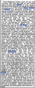 The story of the tragedy has passed into history under the name of the Roche Abbey murder. The murder was atrociously perpetrated. It was accomplished in a most cowardly manner, and the magnitude of the crime was increased by the diabolical plotting which compassed the death of the deceased. John Cooper was a man of twenty-six years of age, working gardener who hid been for some time in the employ of Messrs. Fisher, Holmes, and Co., nurserymen, of Handsworth. His parents lived at Stone, fifteen miles from Handsworth, and on the 9th April, he started from Handsworth to go home.
